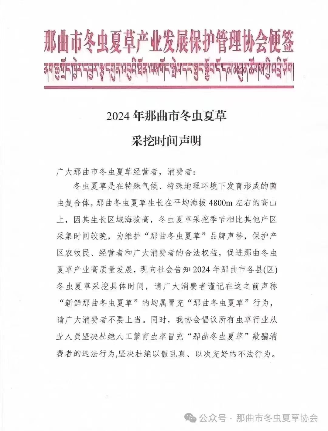 冬蟲夏草是在特殊氣候、特殊地理環(huán)境下發(fā)育形成的菌蟲復(fù)合體,那曲冬蟲夏草生長(zhǎng)在平均海拔4800m左右的高山上,因其生長(zhǎng)區(qū)域海拔高,冬蟲夏草采挖季節(jié)相比其他產(chǎn)區(qū)采集時(shí)間較晚,為維護(hù)“那曲冬蟲夏草”品牌聲譽(yù),保護(hù)產(chǎn)區(qū)農(nóng)牧民、經(jīng)營(yíng)者和廣大消費(fèi)者的合法權(quán)益,促進(jìn)那曲冬蟲夏草產(chǎn)業(yè)高質(zhì)量發(fā)展,現(xiàn)向社會(huì)告知2024年那曲市各縣(區(qū))冬蟲夏草采挖具體時(shí)間,請(qǐng)廣大消費(fèi)者謹(jǐn)記在這之前聲稱“新鮮那曲冬蟲夏草”的均屬冒充“那曲冬蟲夏草”行為,請(qǐng)廣大消費(fèi)者不要上當(dāng)。同時(shí),我協(xié)會(huì)倡議所有蟲草行業(yè)從業(yè)人員堅(jiān)決杜絕人工繁育蟲草冒充“那曲冬蟲夏草”欺騙消費(fèi)者的違法行為,堅(jiān)決杜絕以假亂真、以次充好的不法行為。