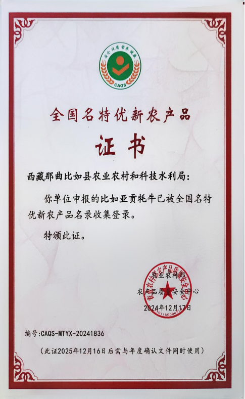 近日,農(nóng)業(yè)農(nóng)村部農(nóng)產(chǎn)品質(zhì)量安全中心正式發(fā)布“2024年第三批全國名特優(yōu)新農(nóng)產(chǎn)品名錄”。其中,由比如縣申報(bào)的“比如亞貢牦牛”成功入選該名錄!這標(biāo)志著比如縣在深入推進(jìn)“智慧牧業(yè)”建設(shè)、促進(jìn)高原特色現(xiàn)代牧業(yè)高質(zhì)量發(fā)展方面取得了又一重要成果。