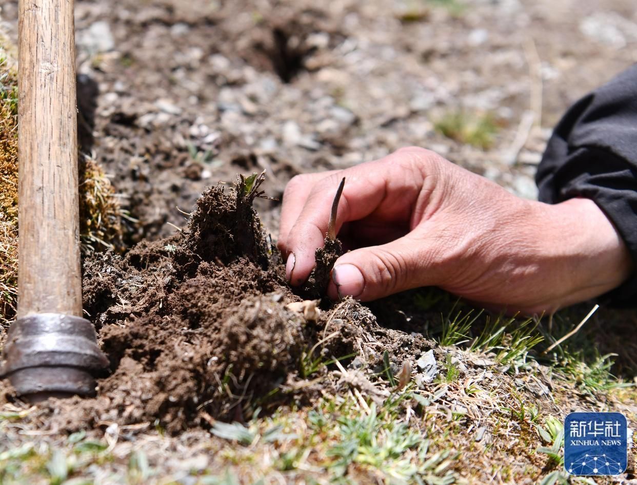 蟲草出土瞬間(5月25日攝)。新華社記者 晉美多吉 攝