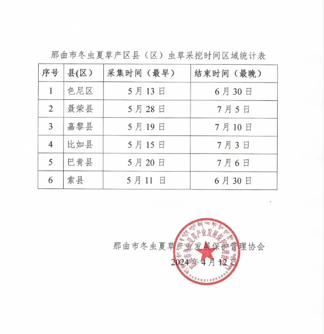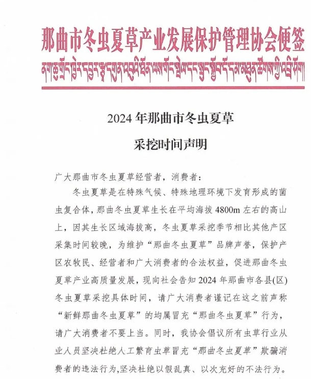 冬蟲夏草是在特殊氣候、特殊地理環(huán)境下發(fā)育形成的菌蟲復(fù)合體,那曲冬蟲夏草生長在平均海拔4800m左右的高山上,因其生長區(qū)域海拔高,冬蟲夏草采挖季節(jié)相比其他產(chǎn)區(qū)采集時間較晚,為維護(hù)“那曲冬蟲夏草”品牌聲譽(yù),保護(hù)產(chǎn)區(qū)農(nóng)牧民、經(jīng)營者和廣大消費(fèi)者的合法權(quán)益,促進(jìn)那曲冬蟲夏草產(chǎn)業(yè)高質(zhì)量發(fā)展,現(xiàn)向社會告知2024年那曲市各縣(區(qū))冬蟲夏草采挖具體時間,請廣大消費(fèi)者謹(jǐn)記在這之前聲稱“新鮮那曲冬蟲夏草”的均屬冒充“那曲冬蟲夏草”行為,請廣大消費(fèi)者不要上當(dāng)。同時,我協(xié)會倡議所有蟲草行業(yè)從業(yè)人員堅決杜絕人工繁育蟲草冒充“那曲冬蟲夏草”欺騙消費(fèi)者的違法行為,堅決杜絕以假亂真、以次充好的不法行為。